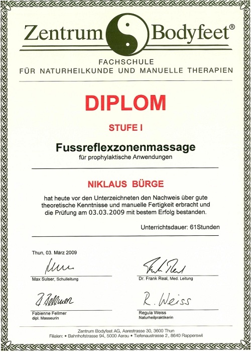 Diplom Fuss-Reflexzonen-Massage an der Massageschule Body Feet in Thun 2009 |