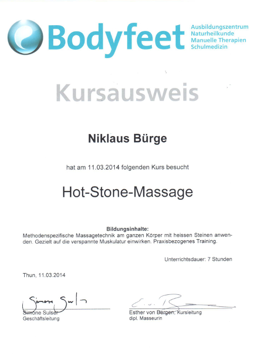 Diplom in klassischer Ganzkörper Massage an der Massageschule Body Feet in Thun 2007/2008 |