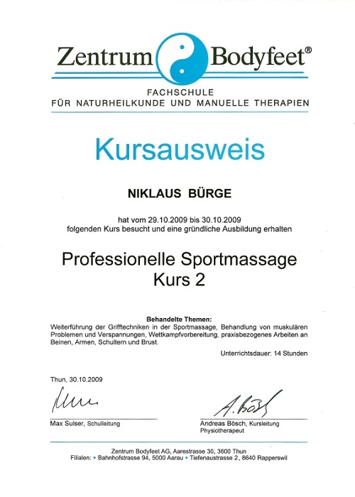 Diplom Fuss-Reflexzonen-Massage an der Massageschule Body Feet in Thun 2009 |